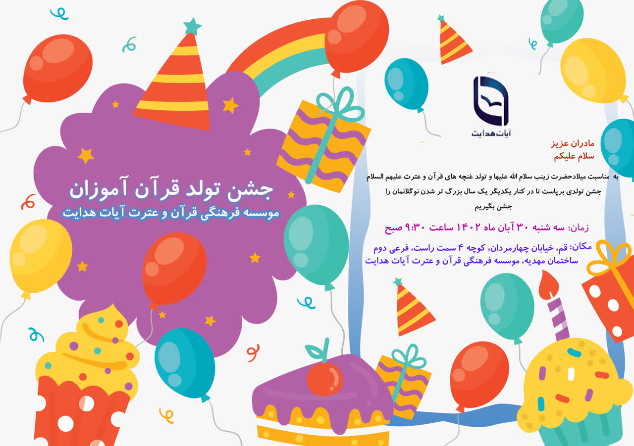 هر ساله در موسسه فرهنگی قرآن و عترت آیات هدایت به صورت نمادین در یک روز برای تمام قرآن آموزان جشن تولدی بزرگ برگزار می شود .
