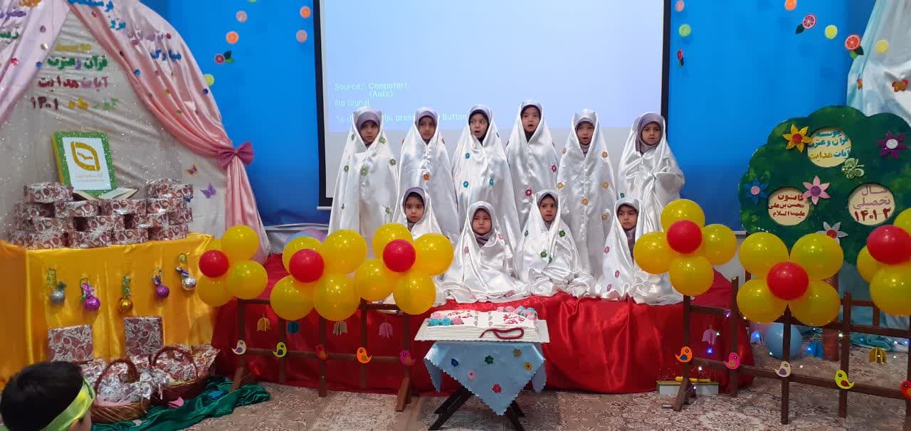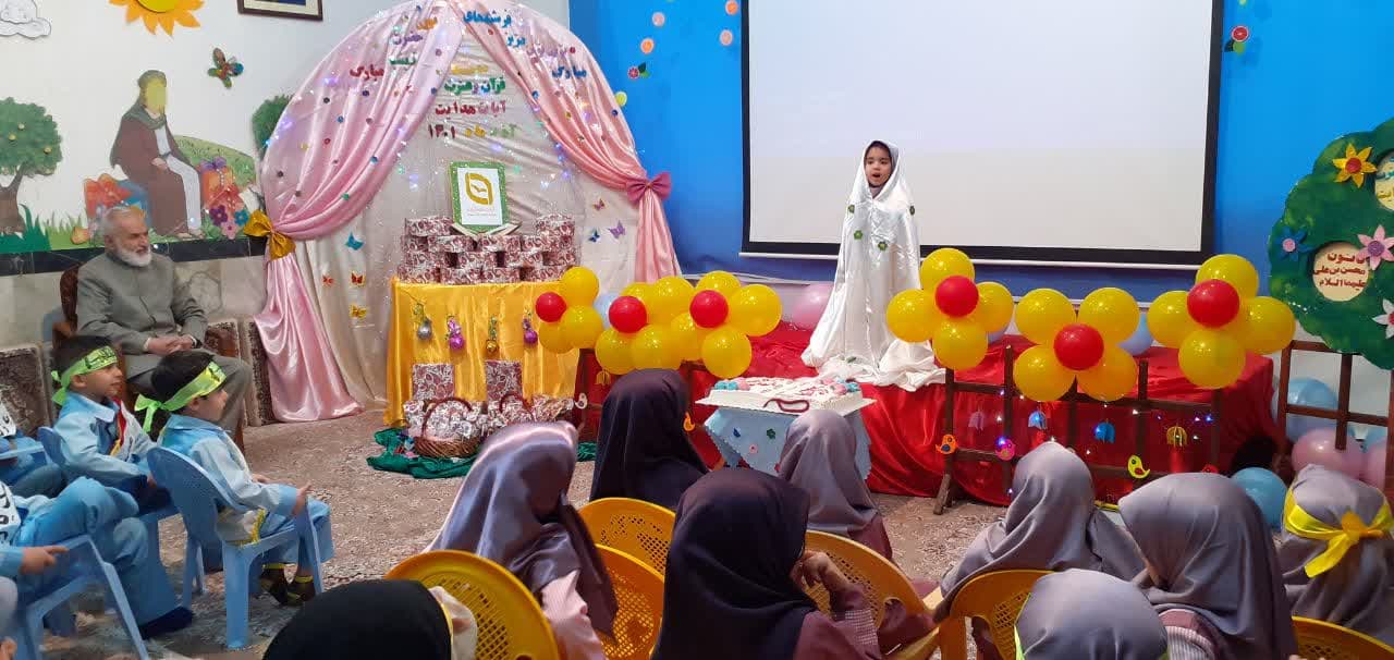 در این مراسم نو آموزان به تلاوت قرآن،اجرای سرود،دکلمه خوانی و شعر خوانی پرداختند. در پایان مراسم به نوگلان و حافظان قرآن هدایایی توسط آقای دکتر عزیزی تقدیم شد.